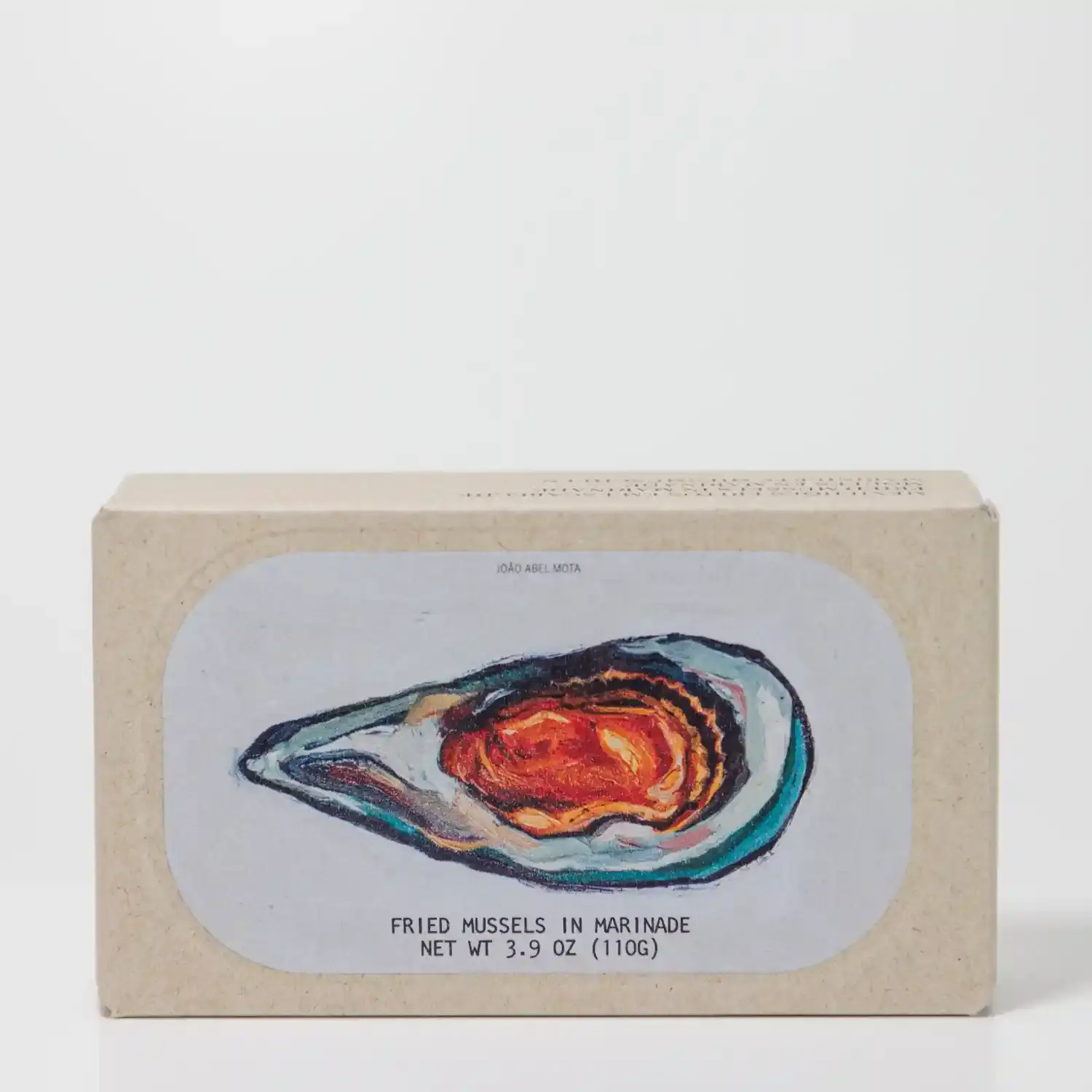 Gekweekte mosselen uit Galicië, Spanje (wereldberoemd om topkwaliteit schelpdieren), gebakken en gemarineerd bij 100 Mistérios. Het bakproces geeft de mosselen extra karakter voordat ze in de escabeche gaan. Handmatig gecontroleerd op kwaliteit. Verpakking ontworpen door een van de bijna 90 Portugese kunstenaars in JOSE Gourmet's artistieke project.